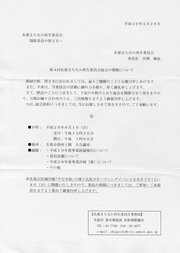 まず、名張まちなか再生委員会による5月28日付文書「第4回名張まちなか再生委員会総会の開催について」をごらんいただく。
