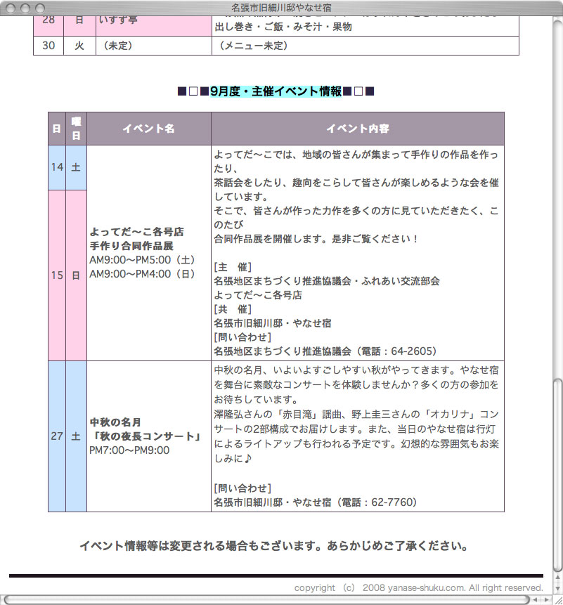 名張市旧細川邸やなせ宿:イベントカレンダー