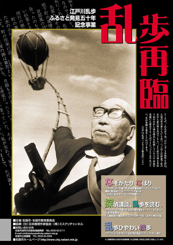 □ここで名張市が日本推理作家協会の協力を得て毎年開催しているミステリ講演会「なぞがたりなばり」のお知らせです。11月22日土曜日、名張市総合福祉センターふれあいで第十八回が催されます。講師は芦辺拓さん。テーマは「〈乱歩〉を生きた男──戦略的な、あまりに戦略的な」。タイトルから察しますに、最初から最後までずっと乱歩のことが語られる本格的な作家論になるのではないでしょうか。詳細は名張市オフィシャルサイトの「第18回なぞがたりなばり開催」でどうぞ。入場券はきょう発売開始です。