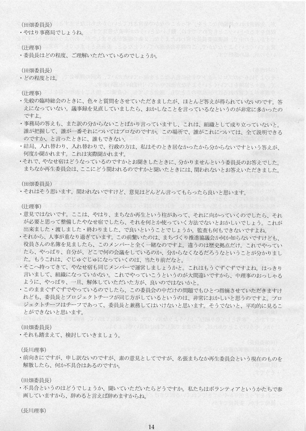 それで、なんの話かというと、名張まちなか再生委員会がどんな状態にあるか、それを知っているのか、という話である。知らないのなら実態を教えてあげよう、という話である。2月25日、名張市役所で開かれた第一回理事会の議事録が手許にあるので、そのスキャン画像を掲載しておくことにする。ちなみに、3月5日付エントリに、議事録を読むのが楽しみだと書いた。