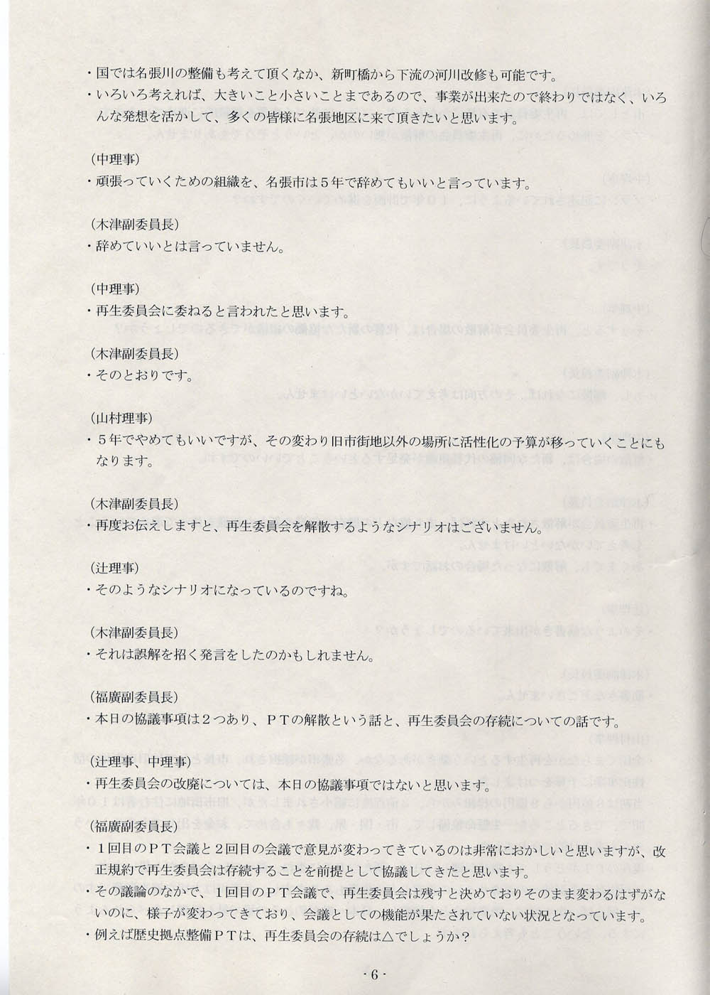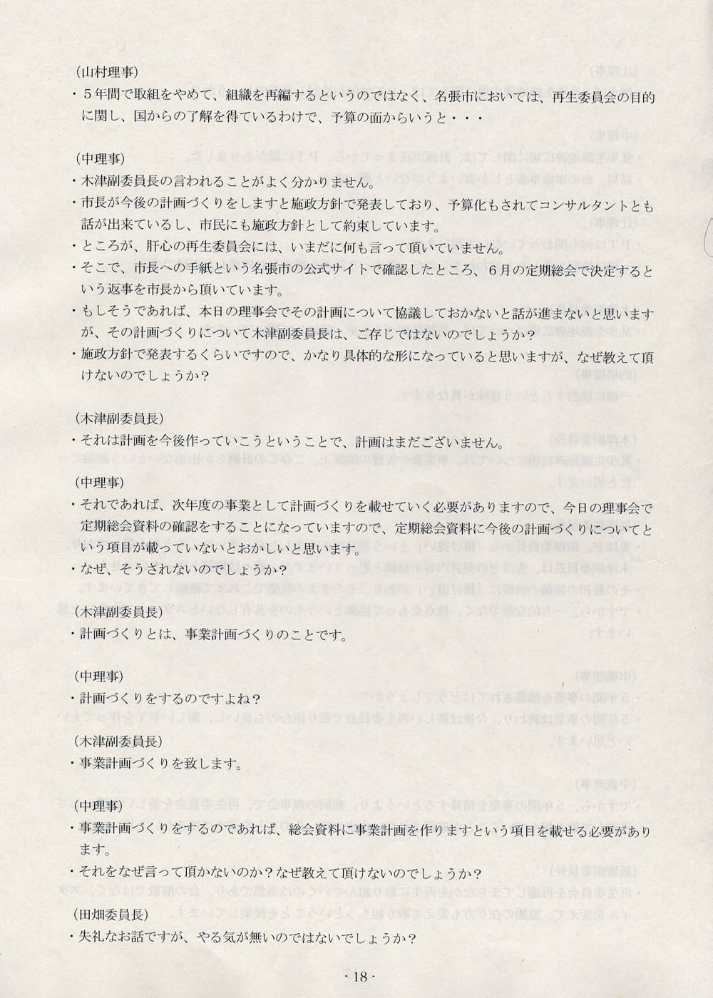 「個人としては、名張地区の再生は、必ず市が取り組むべきことで、絶対に進めて頂く必要がありますが、再生委員会として、改正規約の再改正の検討も含めて、この形で進んでいっていいのかどうかと考えています」
