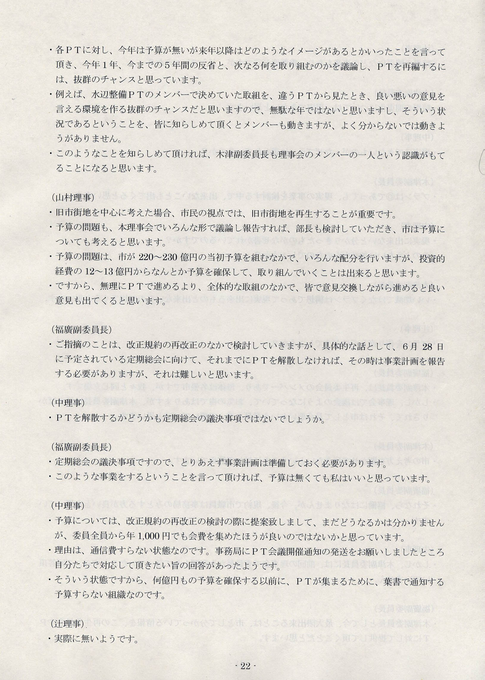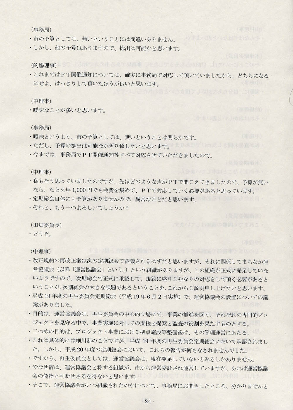 「運営協議会の発足に伴って、運営協議会を明確に位置づけた再生委員会の規約が、一旦は変えないといけないと思いますし、それは総会で正式に諮らないと、このままではいけません」