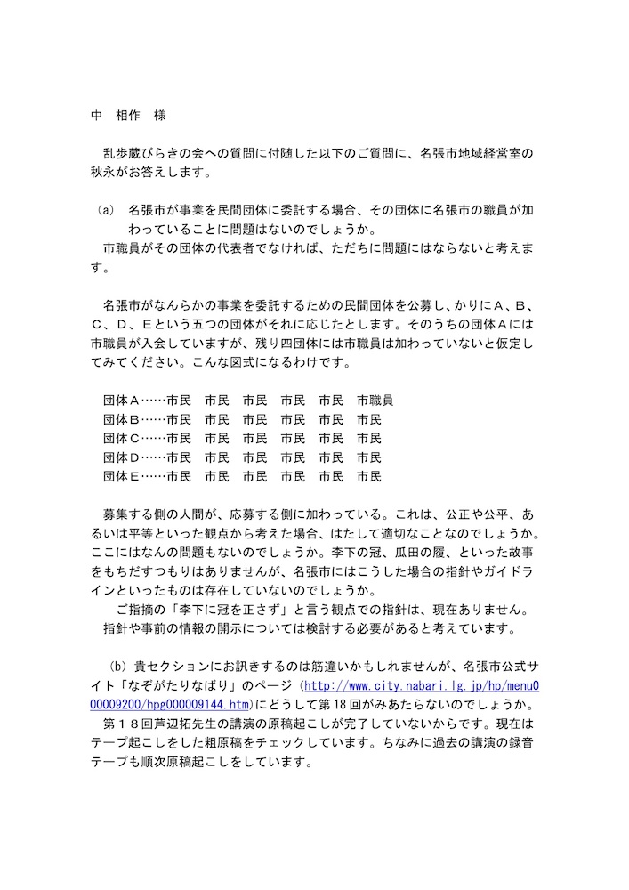 ということで、この問題にかんしては、「市長への手紙」の回答が届いたあとで、またあらためて考えてみたい。