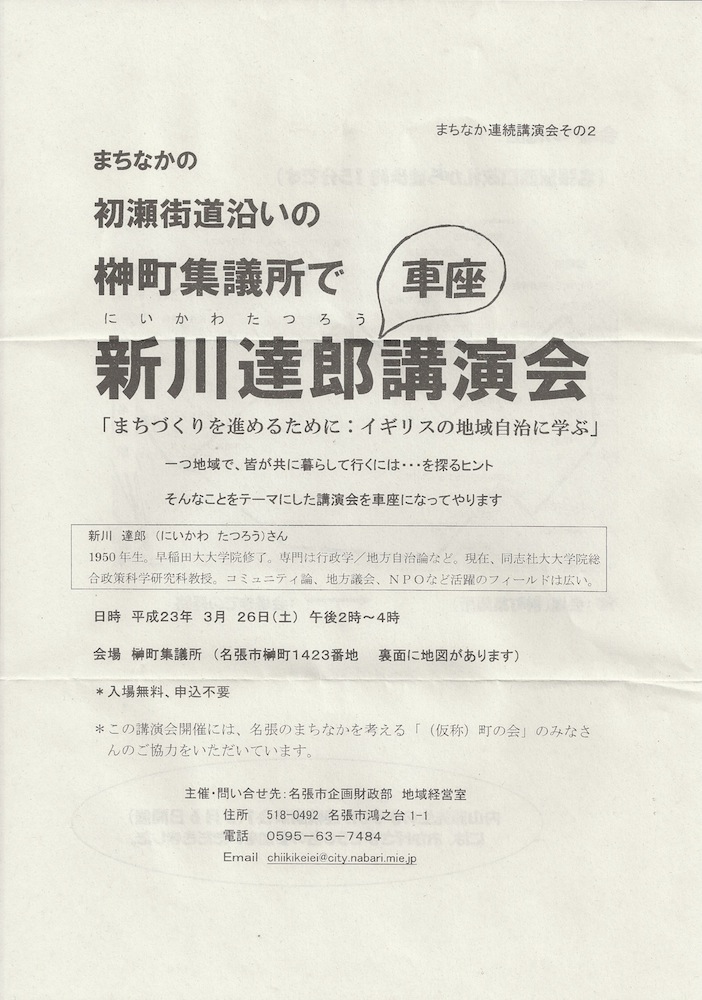 同封されていた文書によると、この「まちなか連続講演会」、3月6日に第一回が開かれて、講師は内山節さん、参加者は五十人、名張まちなか再生委員会の元委員に案内状を送付したのだが、一部に送付漏れがあった、とのことであった。