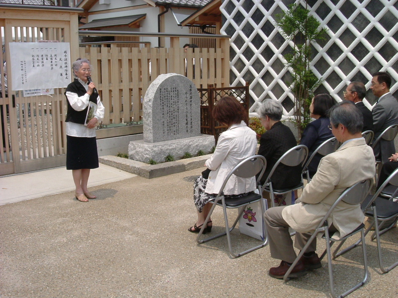 午前11時に始まった橘今滋歌碑の除幕式がそろそろ終わろうかというころおいで、歌碑の横で名張金石文研究会の石原弘子さんが閉式の辞を述べていらっしゃるところであった。写真がこれ。