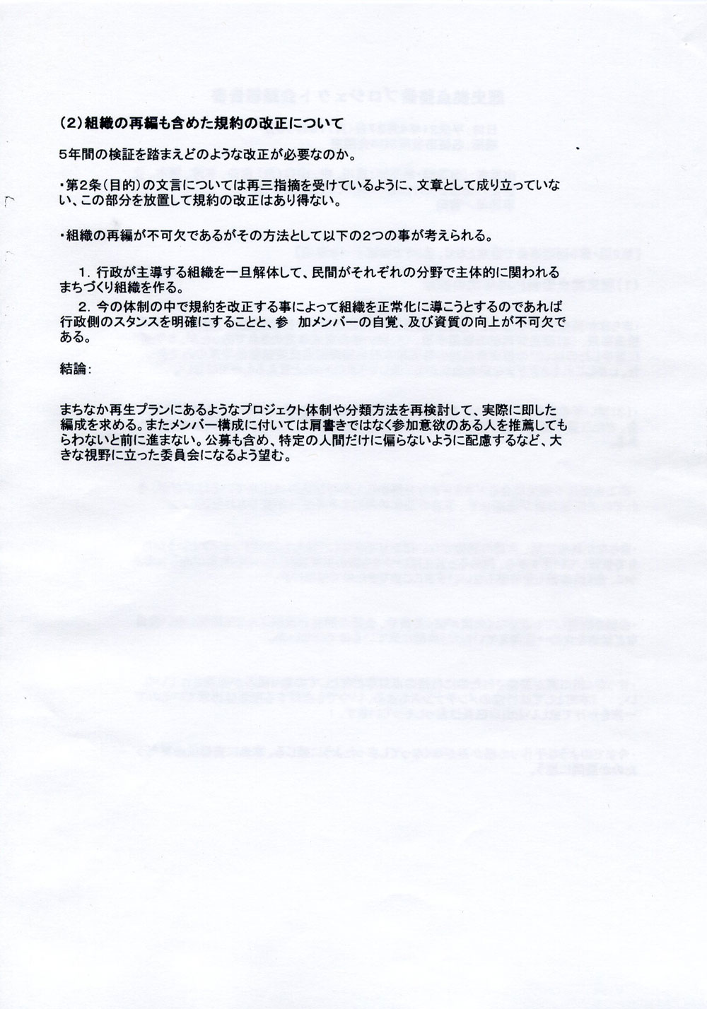 第一条には、協議会と委員会との関係性が規定されている。ただし、協議会が一方的に規約を定めても、それだけで第一条が発効することはありえない。委員会側の規約が問題になる。委員会の規約に、協議会にかんする条項が加えられなければならない。両者の規約が照応し合ってはじめて、協議会の規約は有効になるのである。平成20・2008年6月1日、名張まちなか再生委員会の定期総会において、まちなか運営協議会の発足が報告され、それにともなう委員会規約の改正が審議の末に決定される、というプロセスを経なければ、まちなか運営協議会は規約第一条に定められた「立場」を獲得することができない。しかし、そんなことはいっさいなかった。だから、どうなるのか。名張まちなか再生委員会には、いまにいたってもなお、まちなか運営協議会などという内部組織は存在していない、ということになる。そう判断せざるをえない。