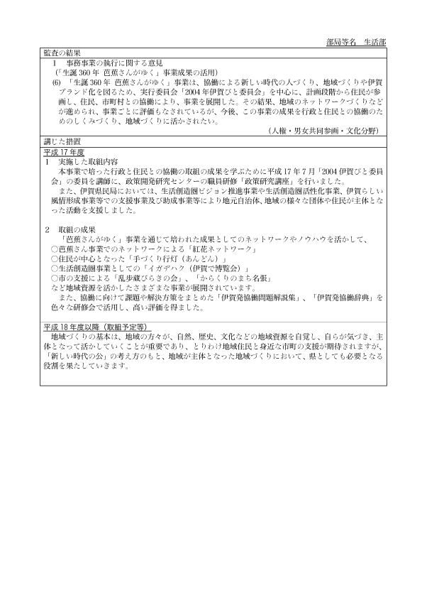 監査の結果 1 事務事業の執行に関する意見 (「生誕360年 芭蕉さんがゆく」事業成果の活用) (6)「生誕360年 芭蕉さんがゆく」事業は、協働による新しい時代の人づくり、地域づくりや伊賀ブランド化を図るため、実行委員会「2004年伊賀びと委員会」を中心に、計画段階から住民が参画し、住民、市町村との協働により、事業を展開した。その結果、地域のネットワークづくりなどが進められ、事業ごとに評価もなされているが、今後、この事業の成果を行政と住民との協働のためのしくみづくり、地域づくりに活かされたい。 (人権・男女共同参画・文化分野)