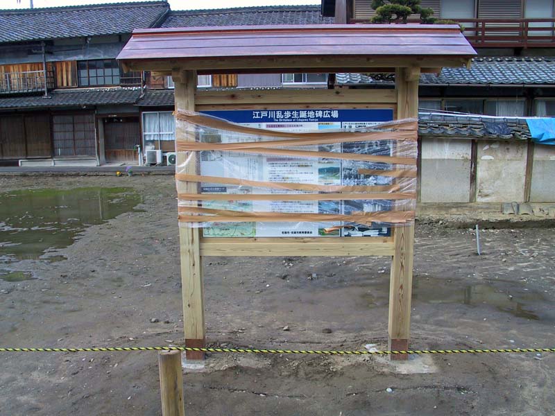 かりに、誰かがはじめて名張のまちを訪れたとする。江戸川乱歩に興味をもっている人である。近鉄名張駅の西口から外に出て、まちなか散策としゃれこむ。乱歩生誕地碑はどこにあるのか。目についた商店で道順を尋ね、てくてくと歩いてゆく。細い路地に入ってさらに進むと、木造住宅が低い軒をつらねた一廓になんだか不自然な印象の広場があって、そこにぽつんと生誕地碑が建っている。広場には案内板やモニュメントも設置されているが、ただそれだけのことである。