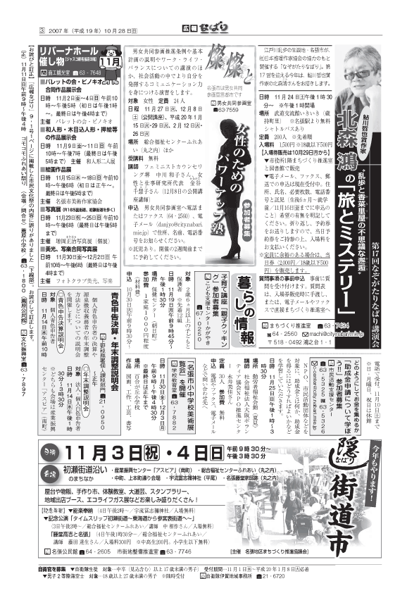 「広報なばり」10月4週号の3ページ。名張地区まちづくり推進協議会が主催する隠街道市の予告記事が掲載されている。「記念公演」とあるのはもちろん「記念講演」の誤変換が校正の眼をまぬがれたものだが、そんな些細なことはどうだってかまわない。