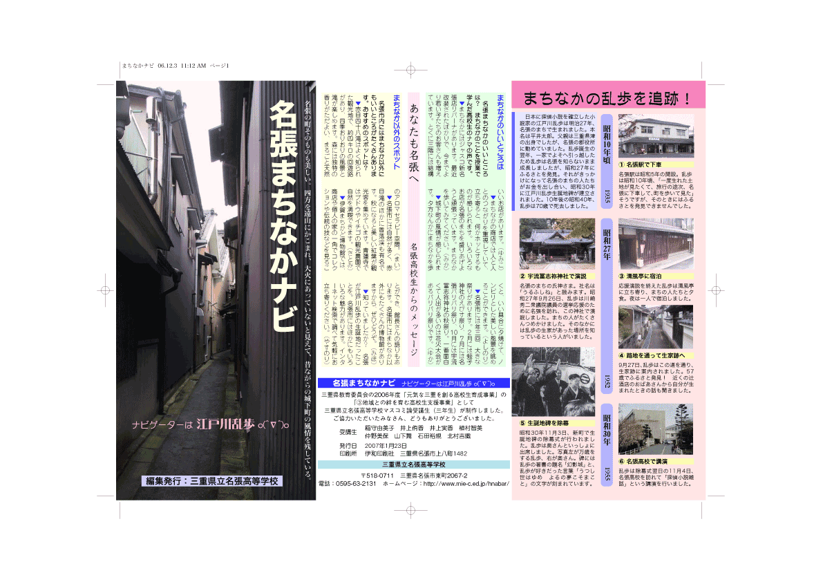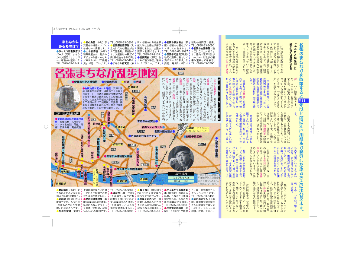 たとえばあの六枚の写真だって、案内板ではなくパンフレットなら生きてくる。それがどこに存在するのかを示しておけば、パンフレット片手に乱歩の言及スポットをめぐる散策が楽しめるであろうし、なにより、まちなかの散歩者が名張の地を去り、それぞれの地域、それぞれの家庭に戻ったあとには、パンフレットの写真は名張のまちを懐かしく思い出してもらうためのよすがともなるであろう。