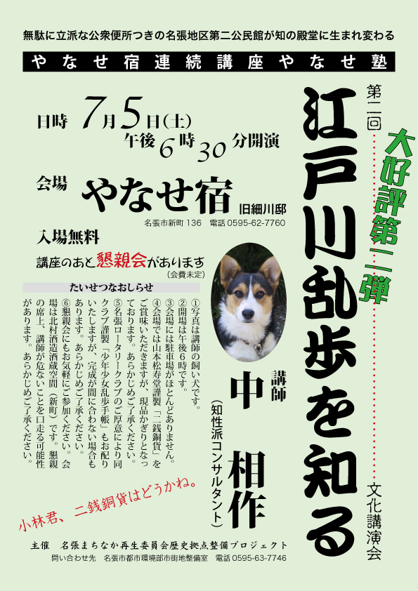 ともあれ、あす5日にはやなせ塾第二回「江戸川乱歩を知る」が開かれます。途中で終わった第一回のつづきからはじめて江戸川乱歩の話題にハードランディングする、みたいな超絶技巧を要する内容といたしたく、ご都合がよろしければぜひお立ち寄りください。山本松寿堂謹製の二銭銅貨煎餅を用意してお待ちしております。