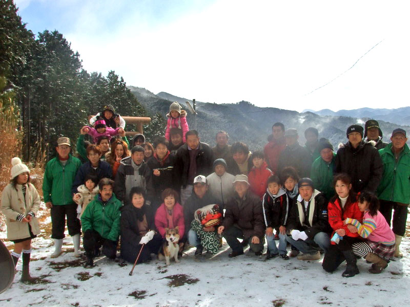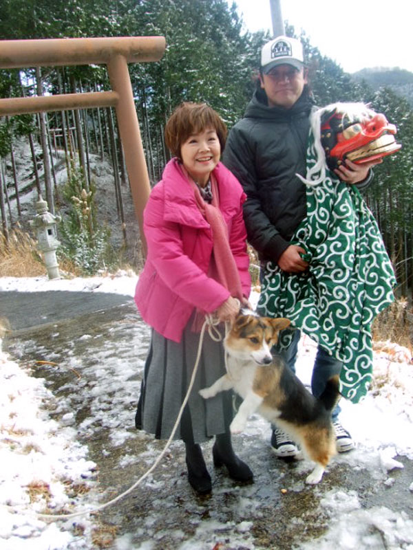 小春ちゃんカワユス、とかそこそこ評判がいいみたいなので、ついつい調子に乗り、本日も小春ちゃん写真館。1月12日、名張市滝之原の赤岩尾神社で撮影した一枚である。キャストを中心に、いあわせたスペシャルサポーターがずらりと勢揃いした。なかに加えてもらったうちの犬は、山田スミ子さんにしっかりおさえていただいて、やはり相当かしこそうにみえる。この写真も、永遠のJガールあらため豪腕のJガールこと吉本興業の新矢由紀さんから送っていただいた。メディア取材用に整列した集合写真で、伊賀タウン情報YOUのウェブニュースにも、このときの写真が掲載されている。したがって、肖像権の問題はきれいにクリアしているものと、手前勝手に判断しておく。