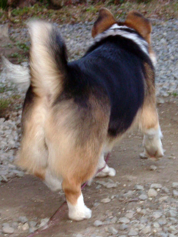 こんどはアフター。きのう夕刻の写真である。断尾したコーギーの尻などみっともなくて眼もあてられぬものだが、うちの犬にはしっぽがあるから、お尻がとてもかわいい。いくらでも絵になる。あまりにもかわいくて絵になるものだから、映画「鬼 The Oni」はうちの犬のお尻で締めることにした。編集の段階で変更になるかもしれないのだが、少なくとも脚本においては、うちの犬のお尻のカットのあと、画面に「結」というエンドマークが登場する。いわゆるケツつながりである。で、映画の撮影後も、ごらんのとおり、あいかわらずお尻がかわいい。