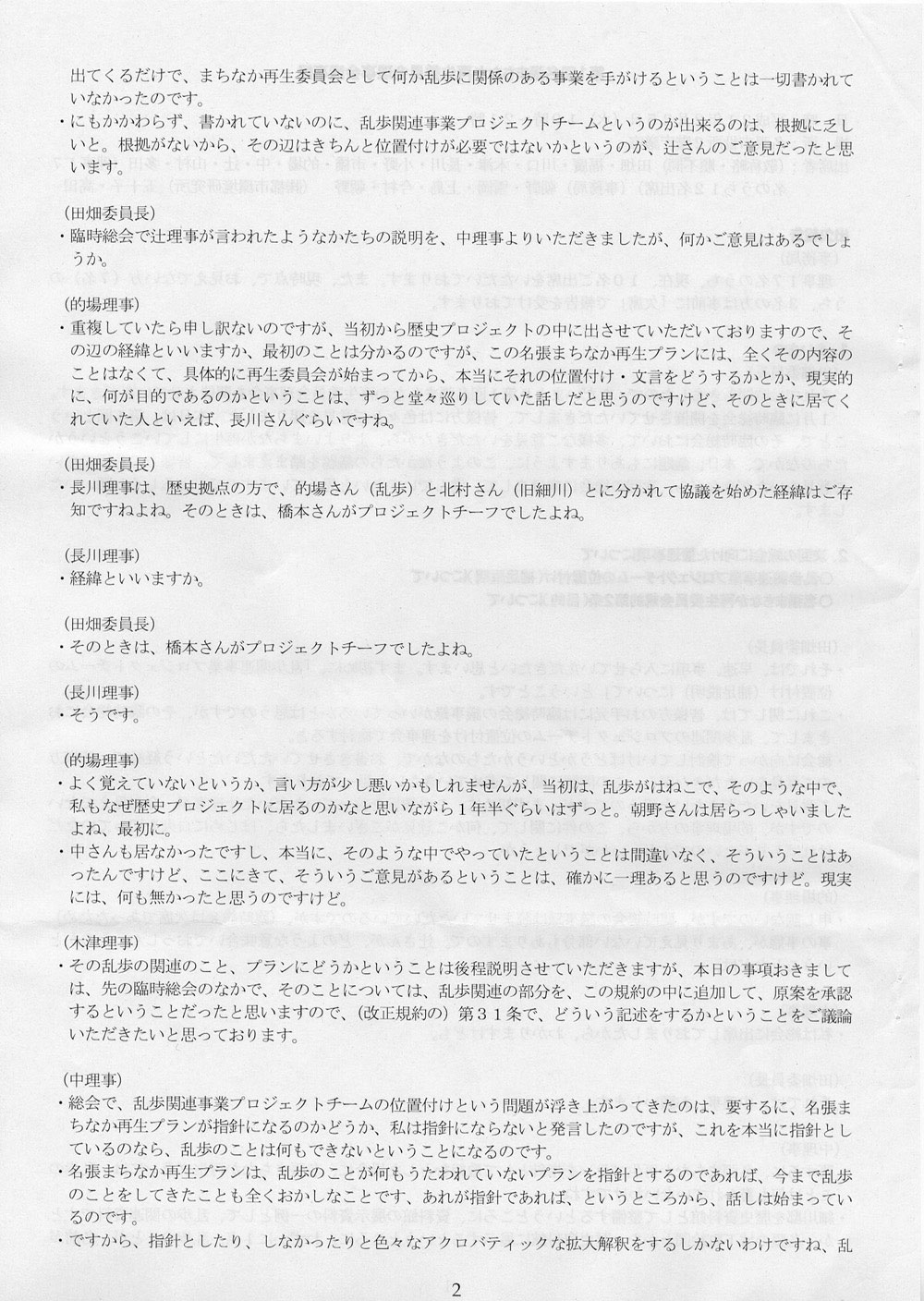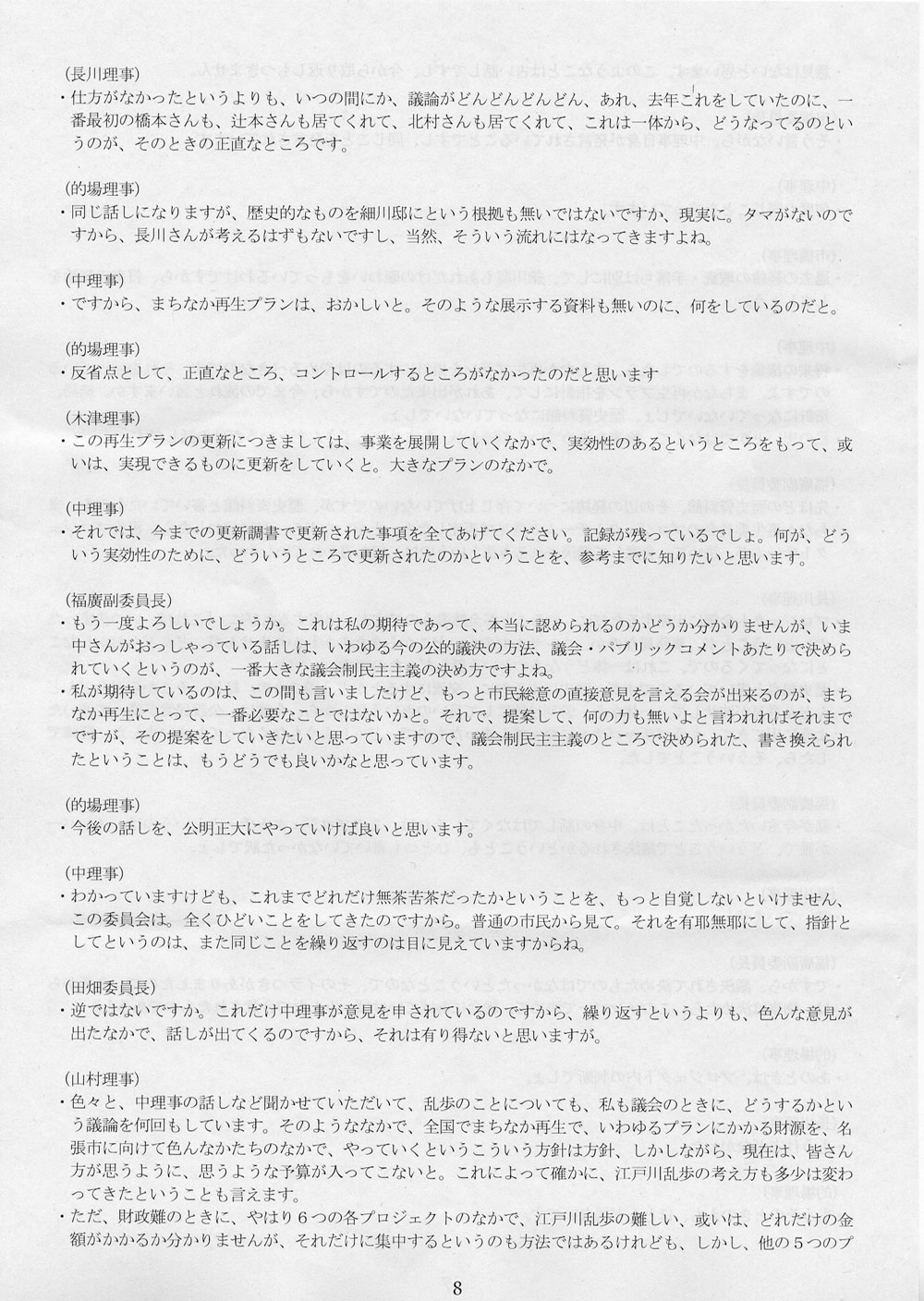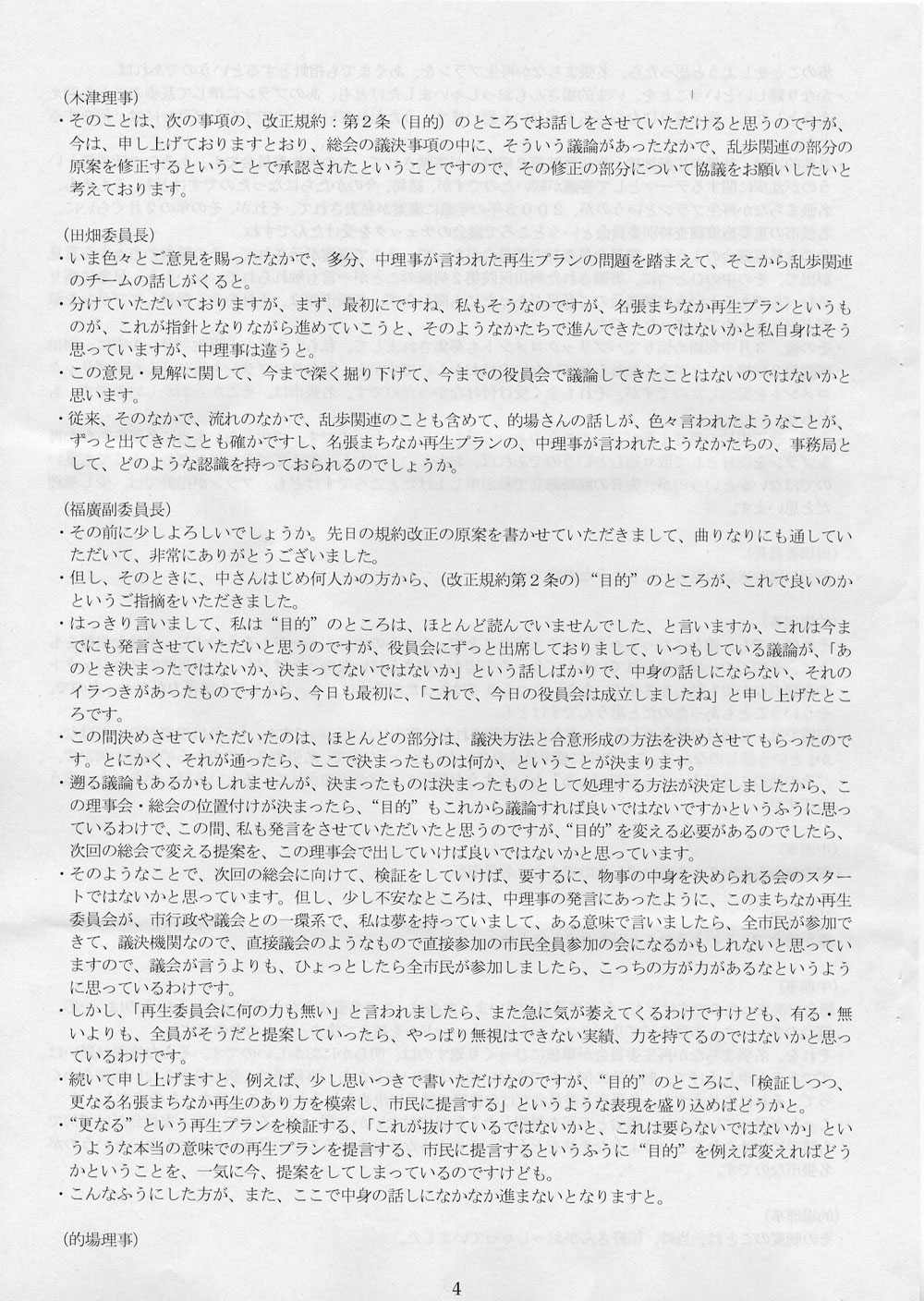それで、なんの話かというと、名張まちなか再生委員会がどんな状態にあるか、それを知っているのか、という話である。知らないのなら実態を教えてあげよう、という話である。2月25日、名張市役所で開かれた第一回理事会の議事録が手許にあるので、そのスキャン画像を掲載しておくことにする。ちなみに、3月5日付エントリに、議事録を読むのが楽しみだと書いた。