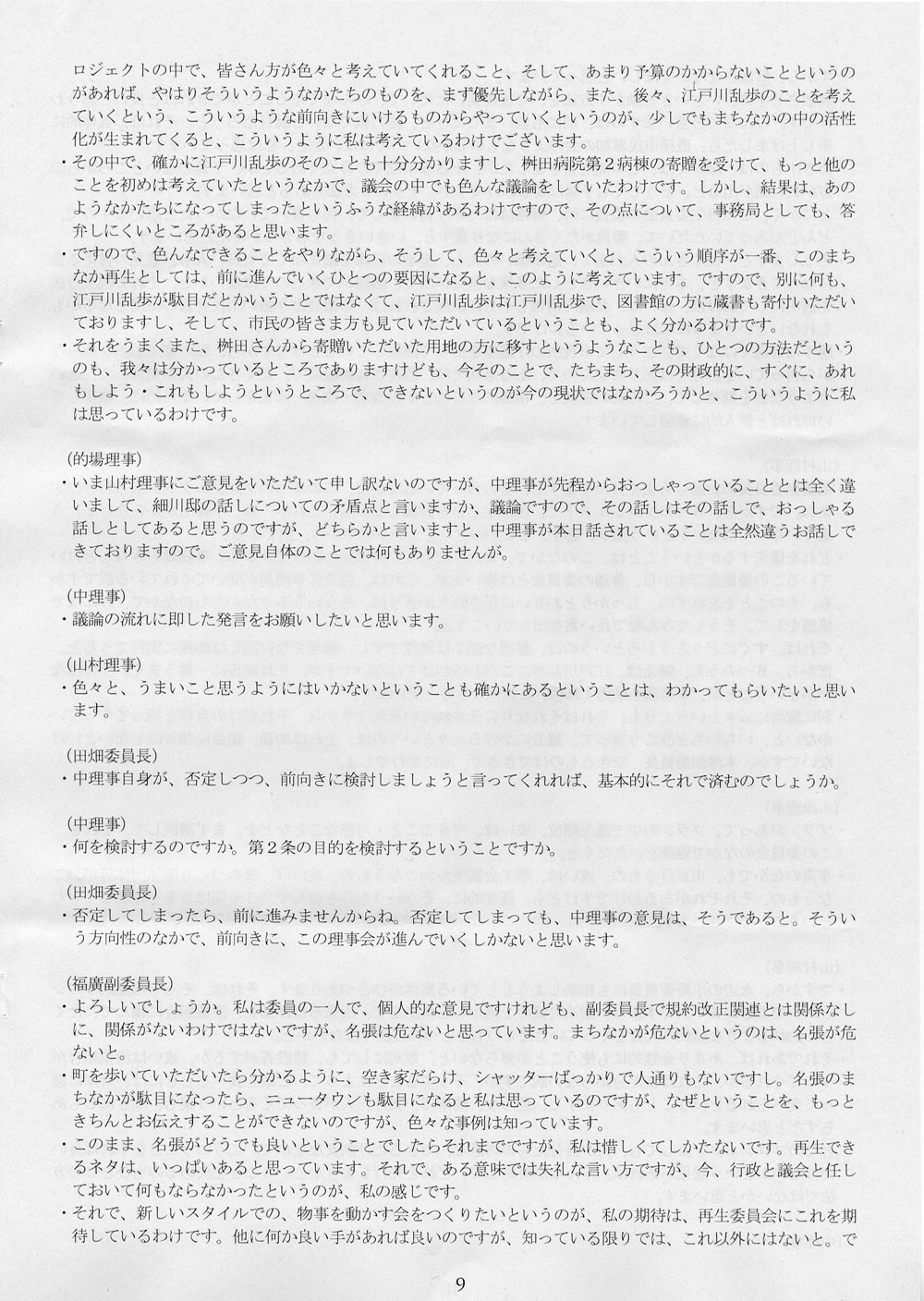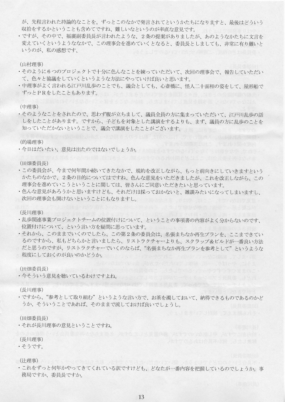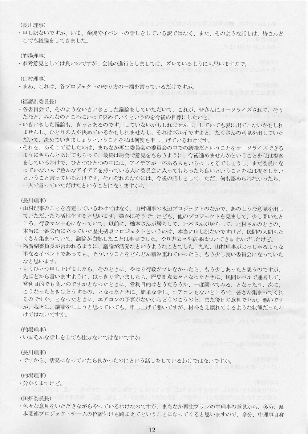 それで、なんの話かというと、名張まちなか再生委員会がどんな状態にあるか、それを知っているのか、という話である。知らないのなら実態を教えてあげよう、という話である。2月25日、名張市役所で開かれた第一回理事会の議事録が手許にあるので、そのスキャン画像を掲載しておくことにする。ちなみに、3月5日付エントリに、議事録を読むのが楽しみだと書いた。