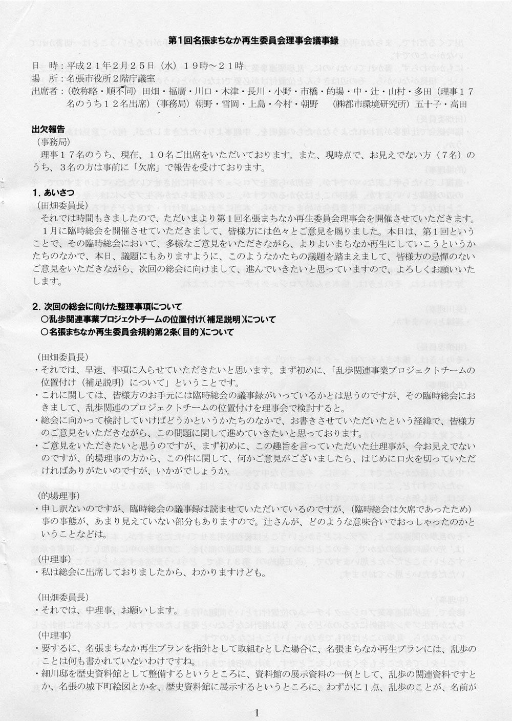 開催日時:平成21年4月1日(水) 19時00分より 開催場所:名張市役所2階 庁議室 【第1回理事会で懸案となり、各PTでご確認いただくこととなった事項】 (1)次の1〜4のいずれを選択されるか、各プロジェクトチームでご確認いただき、第2回理事会でPTチーフよりご報告をお願いします。(※第1回理事会の討議経過の詳細は、別添の議事録でご確認願います)。 1 「改正規約:第2条(目的)」はそのままで、名張まちなか再生委員会を存続させる。 2 「改正規約:第2条(目的)」を次回総会で再改正し、名張まちなか再生委員会を存続させる。 3 「名張まちなか再生委員会」を解散する。 4 「名張まちなか再生委員会」を解散し、代替案(別組織)を提案する。 (2)また、「まちなか再生における今後の取り組みについて」も、各委員より意見をいただき、第2回理事会でご報告いただきますようお願いします。 |