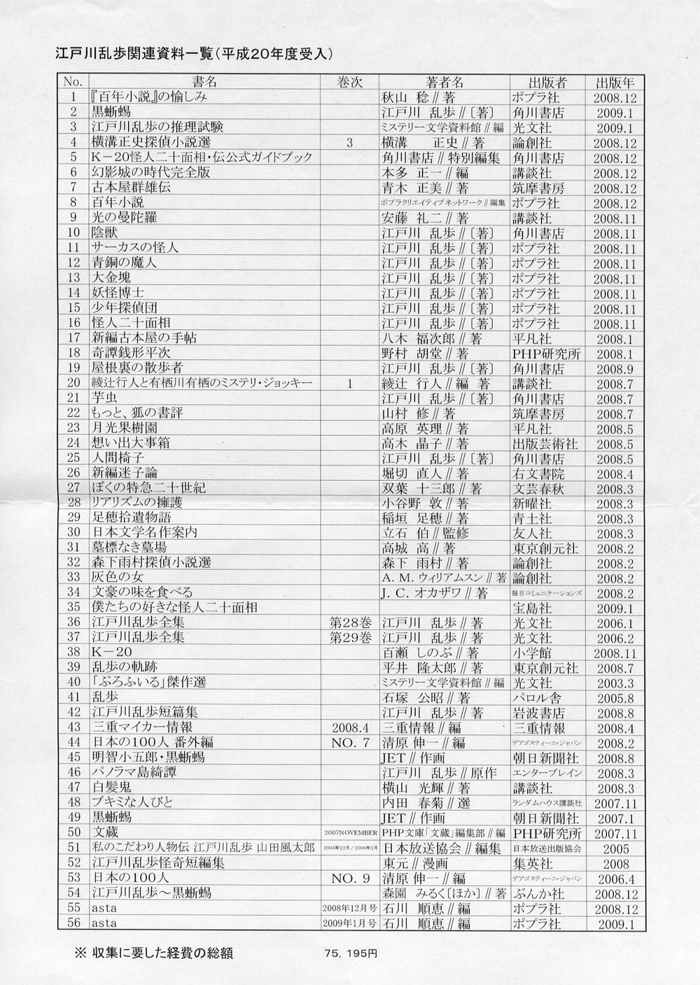 ならば、「江戸川乱歩に関連する図書や雑誌などの資料を、収集・保存に努めてまいりたい」とかいってるご託の実態はどうよ。先日も掲載したが、名張市立図書館の「江戸川乱歩関連資料一覧(平成20年度受入)」がこれである。