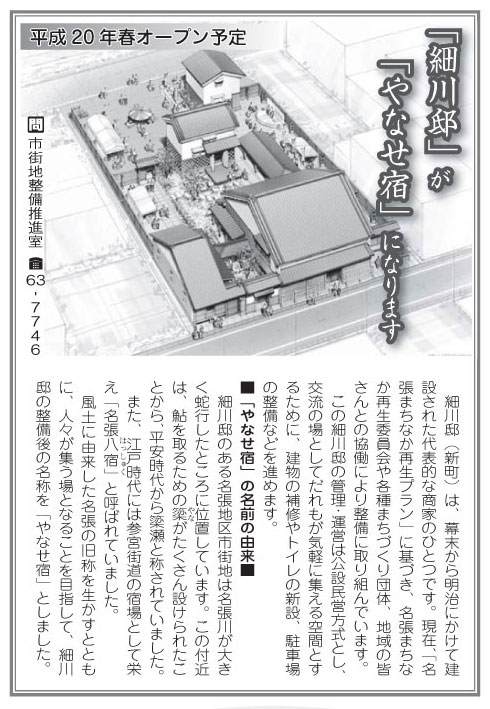 下にかかげるのは、本日付コメントの参考画像。このエントリにも無縁ではないが、おととしの「広報なばり」8月12日号に掲載されたやなせ宿の記事である。「この細川邸の管理・運営は公設民営方式とし、交流の場としてだれもが気軽に集える空間とするために、建物の補修やトイレの新設、駐車場の整備などを進めます」などと書いてある。よくぞほざいた。