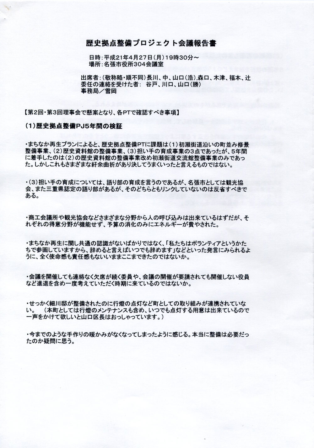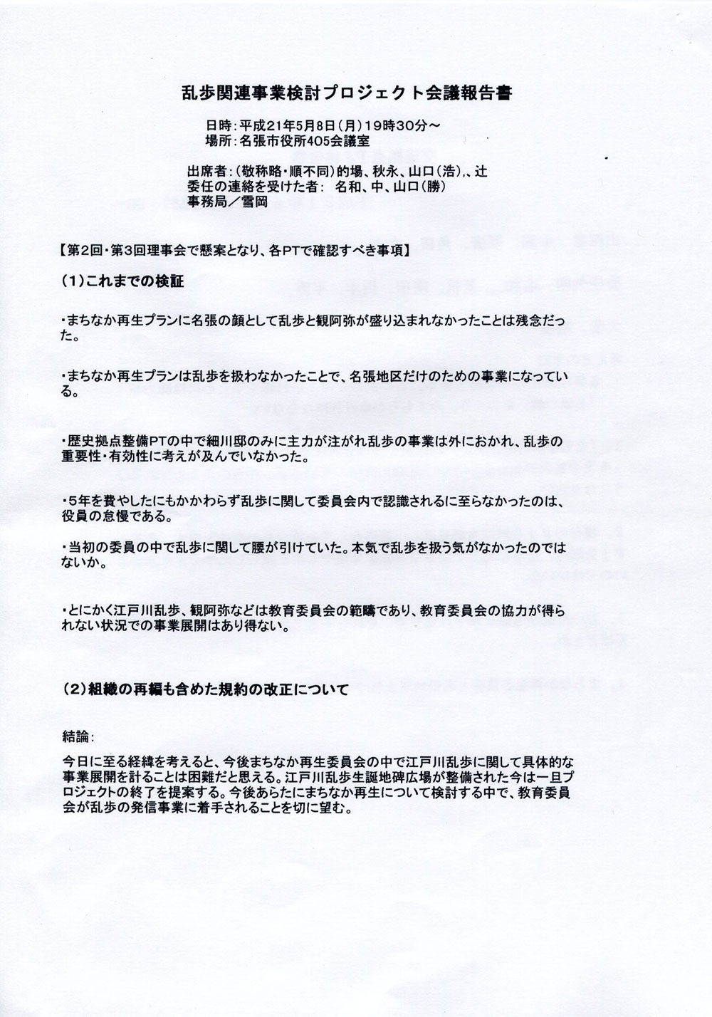 あいもかわらず、名張まちなか再生委員会の話題。先日来、プロジェクトチーム単位の会議がつづいている。4月27日には歴史拠点整備プロジェクトチーム、5月8日には乱歩関連事業検討プロジェクトチームの会議があったのだが、前者は出席、後者は欠席、ということになった。それぞれの報告書がまとめられ、届けられたので、お披露目しておく。