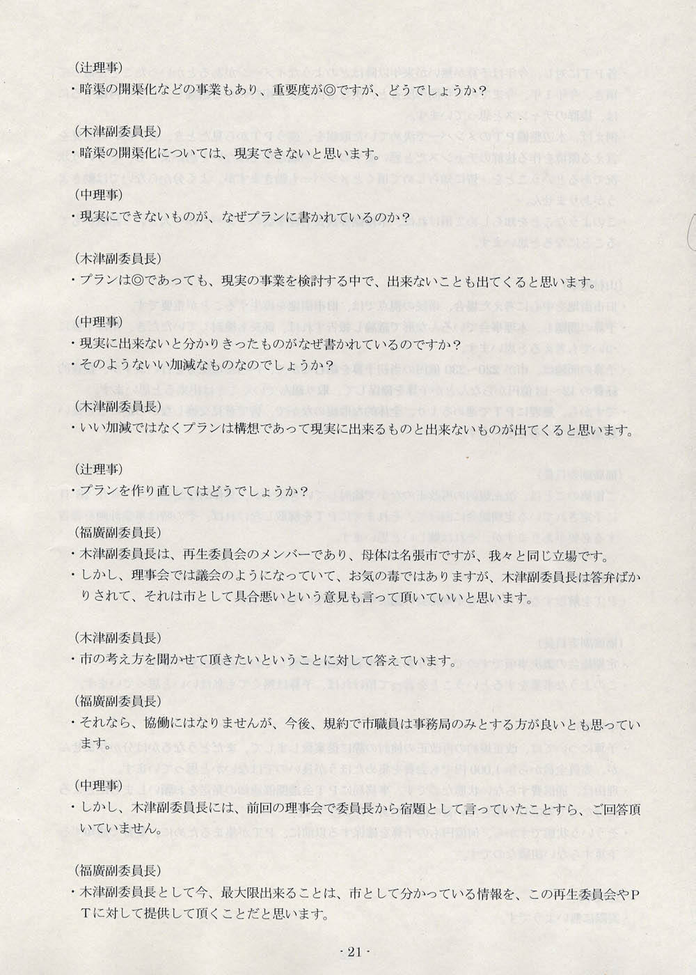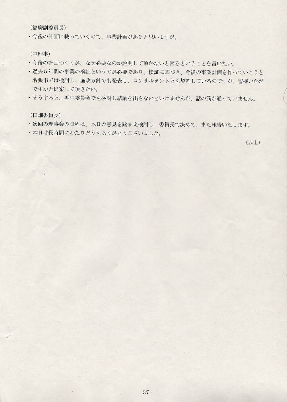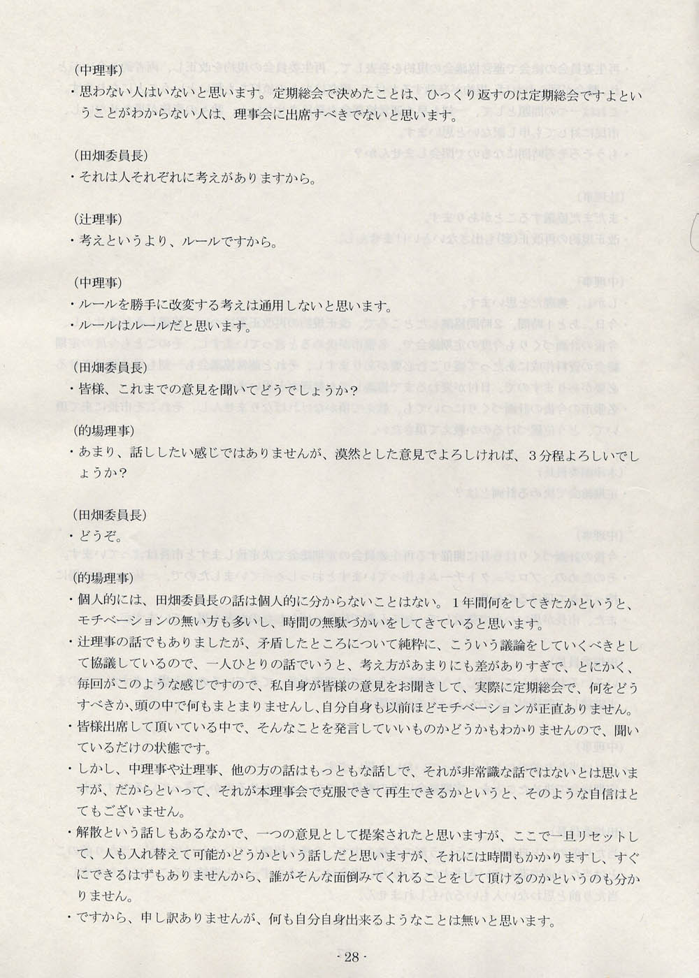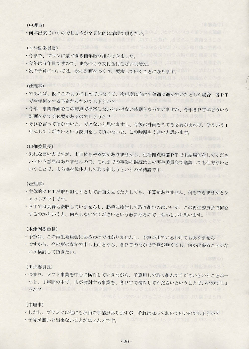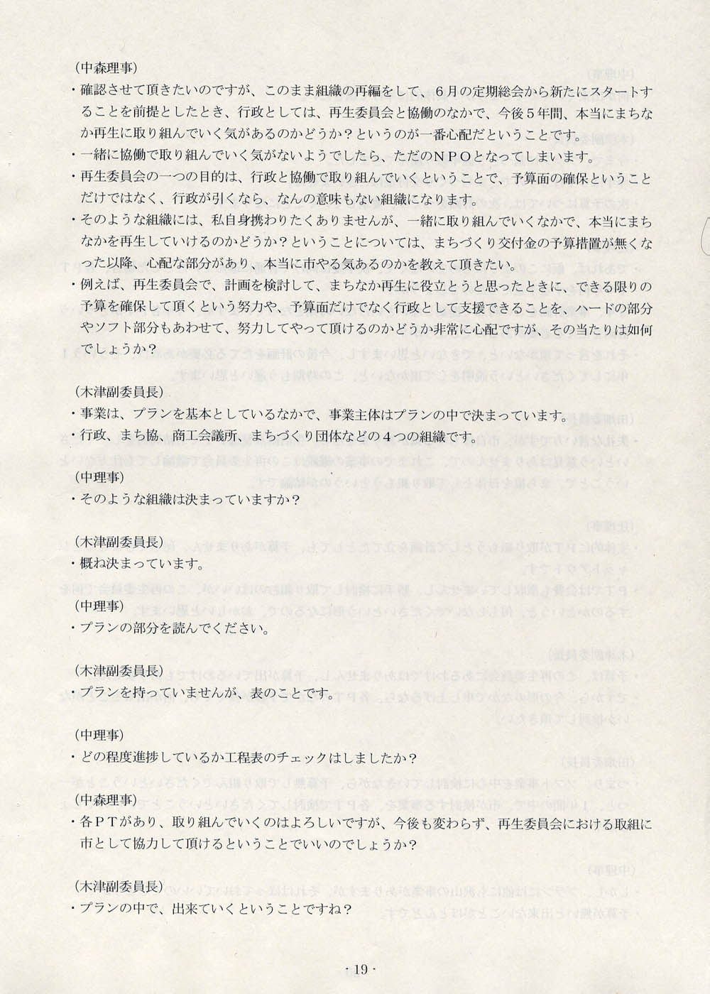 と律儀に尋ねておいてから、きょうも第四回理事会の話題である。議事録の後半、十九ページから三十七ページまでを公開する。二十四ページからそろそろと、まちなか運営協議会なんてまだ発足してないんだもんね、という論証がスタートするのであるが、論述の巧拙という問題はあるにしても、ひととおりお読みいただければ、屁理屈をこねてるとか、重箱のすみを突っついてるとか、そういったレベルの話ではまったくないということが、どなたにも理解していただけるものと思う。げんに、三十ページからはこんな発言がなされている。