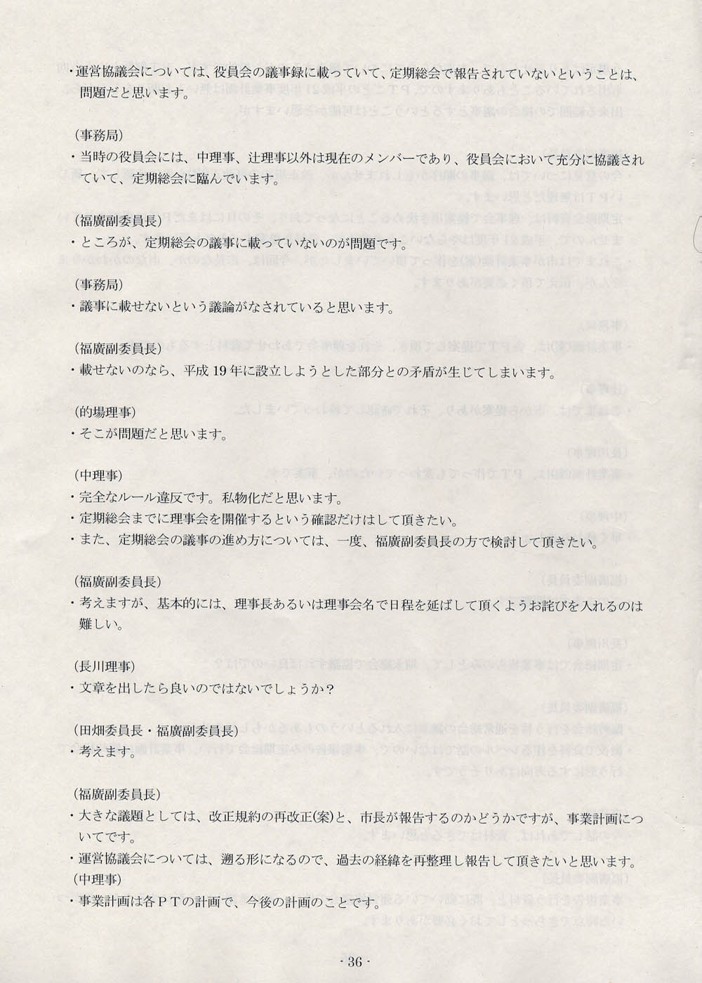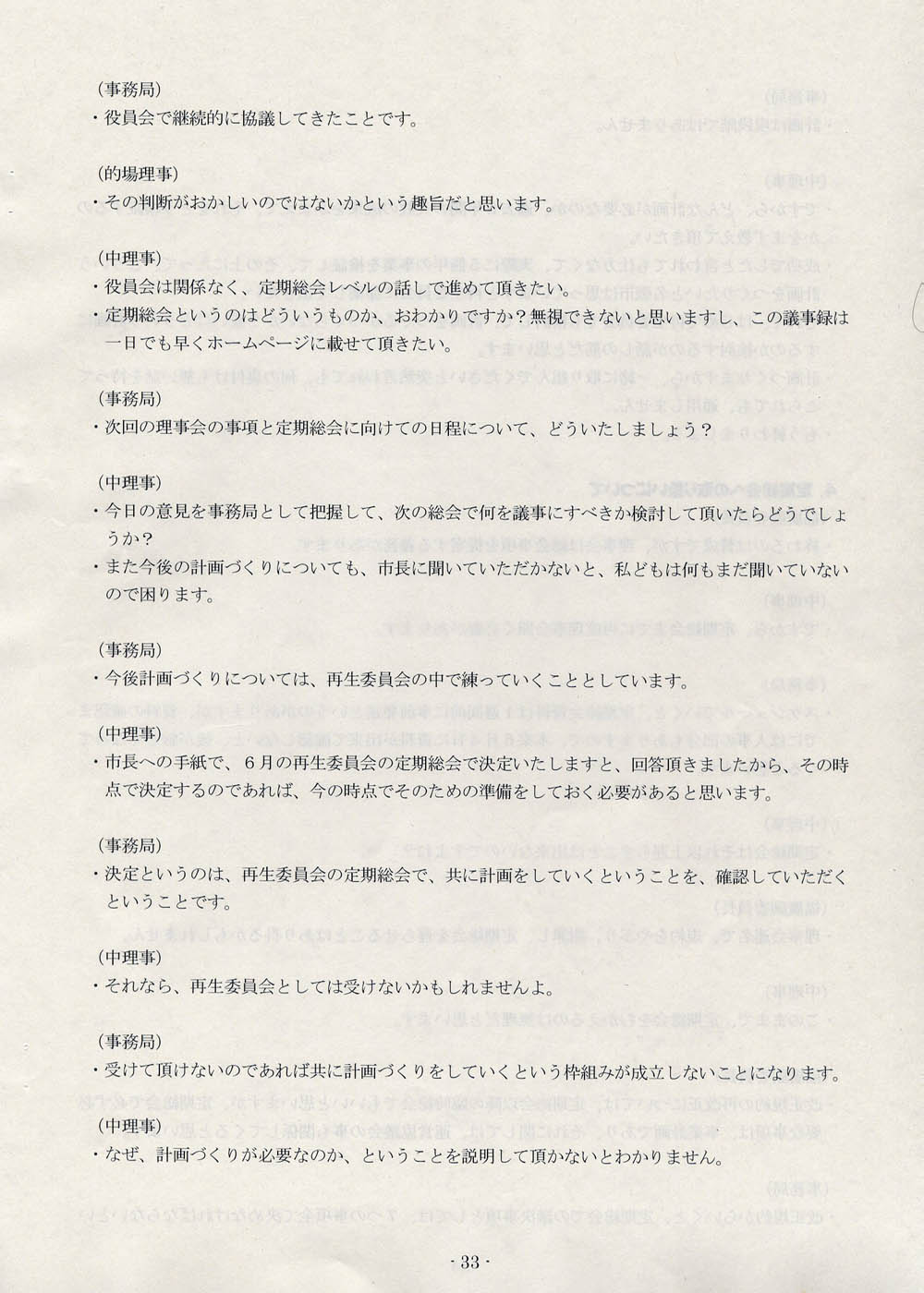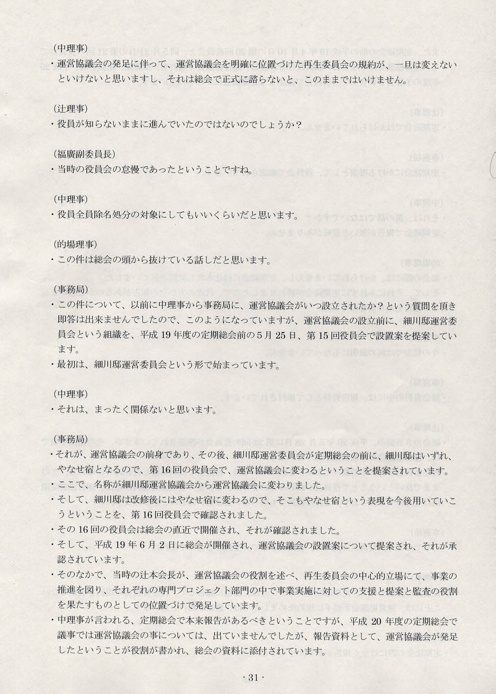 「運営協議会の発足に伴って、運営協議会を明確に位置づけた再生委員会の規約が、一旦は変えないといけないと思いますし、それは総会で正式に諮らないと、このままではいけません」
