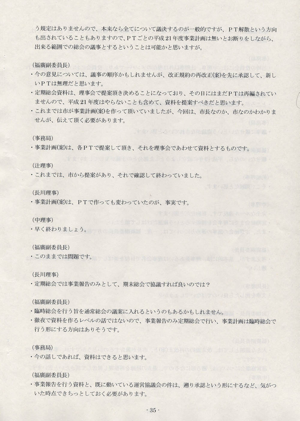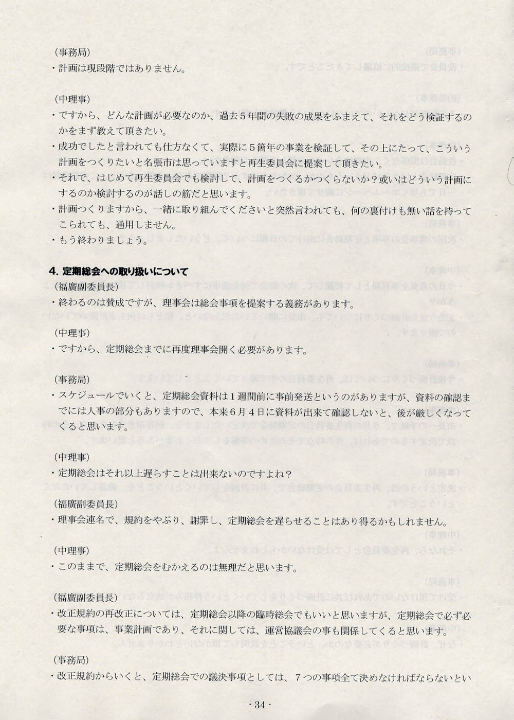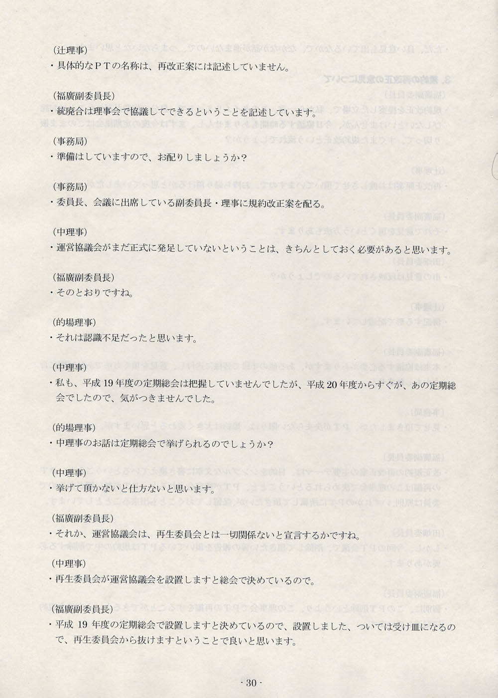 「運営協議会の発足に伴って、運営協議会を明確に位置づけた再生委員会の規約が、一旦は変えないといけないと思いますし、それは総会で正式に諮らないと、このままではいけません」