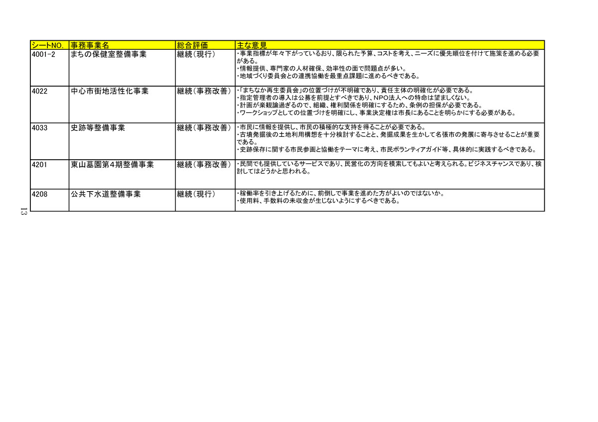 しかし、大丈夫かほんとに、とわれながら思う。思いながらつづけるけど、とにかくまあ、名張市役所のみなさんには、へたに頭をつかおうとしないほうがいいんじゃね? とアドバイスしておくのがいいであろうな。なにしろ、お役所の人である。考えることといったら、あいもかわらぬ責任回避、名張商工会議所がどうの、名張地区まちづくり推進協議会がこうの、そんな名前をもちだして主体性をすっかり放棄してしまい、恥知らずなまでに責任を回避してしまう、みたいなことになるのは火をみるよりも明らかであろう。とはいえ、なんのかんのご託を並べてみたところで、まちなか再生事業の最高責任者は、いうまでもなく名張市長なんだぞ。いまさらおれがいうまでもなく、平成19・2007年、つまりおととしの10月に名張市考査委員会が提出した「名張市事務事業評価報告書」にも、「中心市街地活性化事業」の項におなじことが記されている。