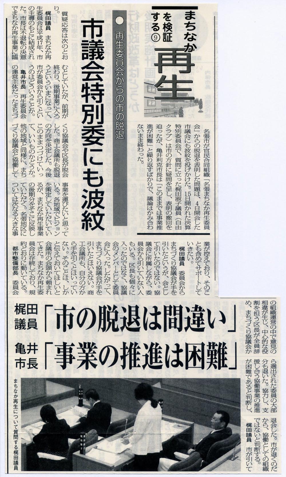 都市整備部長:はい、先ほど市長の方からご説明申し上げたところでございますが、多様な主体が協働してこのまちづくりを円滑に進めていく、そういうことで再生委員会を組織をいただいた、こういうところでございます。しかしながら組織の運営の中で色んな意見の相違が生じてまいりまして、今後のまちづくりの中心的な役割を担っていただければならない区長さん方全員退かれ、また個々の意見だ、意志だと思いますけれども、まち協から選出をいただいておる委員の大部分の方も退かれた。