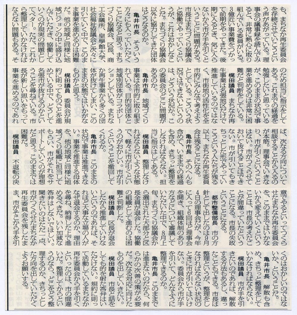 梶田議員:まあ非常に担当部長として苦しい答弁をしていただきましたがね。しかしね、これこのなかにはきちっとした市の内部の中にもねプロジェクトを作られて数名の方がきちっと位置づけられた中でお互いの議論してきてるんですね、で、これね、この12名の方プラス市の職員の方がいくら退くといわれてもあとこのまちなか再生委員会というのを存続させて行こうやないかという声が大きくあがってるんですね。私もこれあの、この頃情報公開きちっとしていただけますので、9月4日の理事会の議事録、これはインターネット第2チャンネルに載りました。これを見るようにて教えていただいたので私はきっちりとこれを引きました。でもねみなさんね、インターネットに載ってるのがおかしいと言うんやったらこれはきっちりとした、出された議事録なんですよね。ですからこう言うことの判断をするのには議事録の中身を読ませていただきましたらね、非常に熱心にこのことを取り組まれている委員がいるわけですよ。で、その委員会の中で色んな個人的な引っ張り合いとか色んな議論の中では行き違いもあったと言うことは知っておりますがね、私が言いたいのはこの事業は、仮にも3億近い事業費を使って、前期やってきた。そしてね、国へも申請出してこういうまちなか再生委員会をすると言うことで受け皿を作ったということで補助金もおりたんでしょ。そして物事を進めてきて、後期に入るときにもう市は気にいらんから手を引きますって、ここなんですよね、市の手の引きかたですよね。そしてその市長の頭の中には次にはまちづくり協議会と一緒に協働でしていくって、これって余計おかしな事ですね。