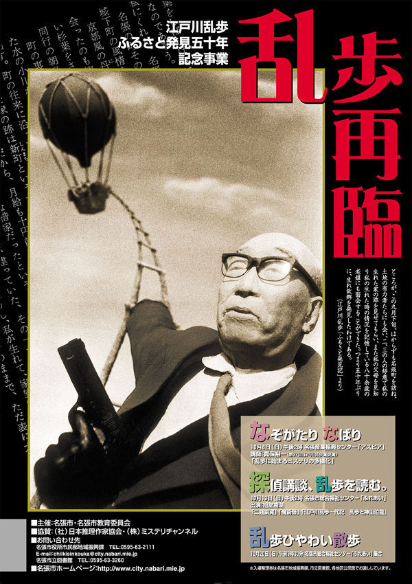 かねがね三重県名張市を一度は訪れなければならないと思ってきたが、やっと二〇〇五年十一月になって宿願を果せた。江戸川乱歩生誕地碑建立五十周年を記念して、東京の推理劇専門劇団フーダニットが初の地方公演、辻真先書き下ろし脚本による「真理試験─江戸川乱歩に捧げる」を上演したせいもあって、どうにか重い腰を上げられたものだ。