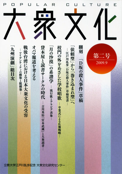 立教大学大学院の院生にして同大学江戸川乱歩記念大衆文化研究センターにお勤めの落合教幸さんも、藤井さんに同行していらっしゃった。平成17・2005年、立教大学で催された「読売江戸川乱歩フォーラム2005」のあと、新宿ゴールデン街の「幻影城」という店にごいっしょして、それ以来のご無沙汰である。そういえば、新宿始発の山手線車内でごくわずかな時間、不覚にも居眠りをしてバッグを置き引きされたのは、「幻影城」を出て、新宿駅で落合さんにお別れしたあとのことであった。落合さんからは、「『大衆文化』で『D坂の殺人事件』の草稿を紹介しました」と教えていただいた。「大衆文化」は同センターの刊行物で、「大乱歩展」に間に合わせるべく第二号の編集が進められたらしい。東京から戻ったら、拙宅にも一冊、お送りいただいてあった。これである。