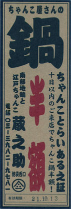 蔵之助とのつきあいも、もう十年以上になる。上京して、乱歩のことでお世話になったみなさんと飲むことになり、池袋で適当な店を探して、たまたま入ったのがこの蔵之助だったのだが、いつのまにか、大宴会は蔵之助、ということになってしまった。平成14・2002年、探偵講談池袋公演のあとの大宴会は、探偵講談の会場で飛び入りの参加者を募ったせいもあって、広い座敷に七十人ほどが押しあいへし合いする仕儀となった。あんな大人数の大宴会は、蔵之助でもめったにないのではないか。その日の幹事役は、その筋で「女王」の尊称をたてまつられているミステリーマニア、石井春生さんにお願いしたのだが、会費を集計した石井さんが、「中さ〜ん、『貼雑年譜』が買えるくらいお金が集まっちゃいましたよ〜」とうれしそうにおっしゃっていたのが記憶に残っている。『貼雑年譜』というのは、おとといも記したとおり、乱歩がつくったスクラップ帳なのだが、探偵講談池袋公演の前年に東京創元社から二百部限定の復刻版が出版され、内容のみならず本体三十万円という価格でも、乱歩ファンや探偵小説マニアをうならせていたのである。