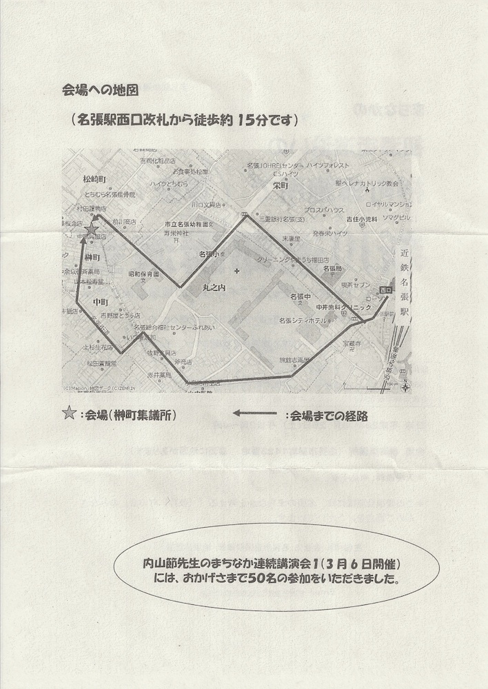 同封されていた文書によると、この「まちなか連続講演会」、3月6日に第一回が開かれて、講師は内山節さん、参加者は五十人、名張まちなか再生委員会の元委員に案内状を送付したのだが、一部に送付漏れがあった、とのことであった。