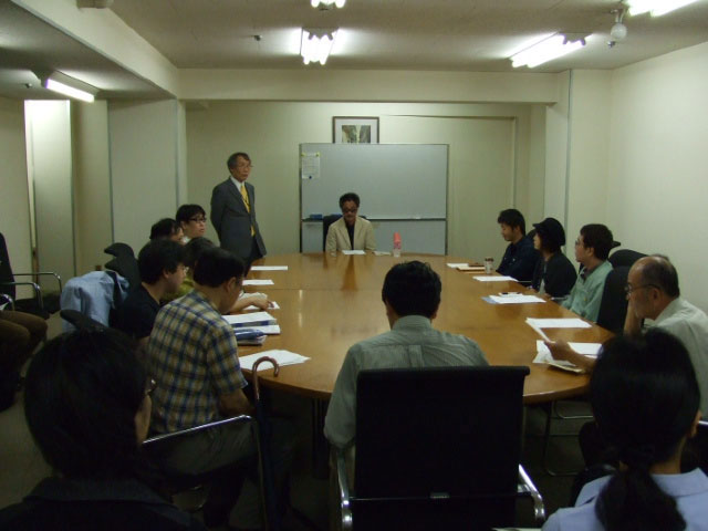 不吉な予感は一掃され、権田先生もお書きになっていらっしゃるとおり、「狭い地下会議室はいっぱいになった」。会議室には楕円形のテーブルが置かれ、空いたスペースにはパイプ椅子が二列か三列並べられていたのだが、なにしろ狭いところだから、すぐいっぱいになるのである。念のために会場の証拠写真を、なんの証拠なんだかよくわからんのだが、とりあえず掲載しておく。