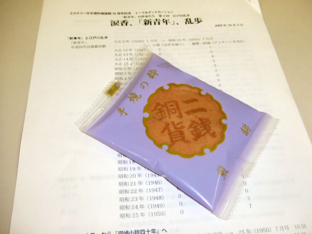先日はありがとうございました。おかげさまで10月3日、東京都豊島区池袋のミステリー文学資料館でトーク&ディスカッション「『新青年』の作家たち」第一回の講師役を無事に務め、お世話をおかけしました二銭銅貨煎餅と名張市のノベルティグッズも参加者のみなさんにお渡しすることができました。みなさんには喜んでいただけましたし、また、名張市にかんする質問を頂戴するなど、乱歩生誕地としての名張市にも興味をもっていただけたと思っております。ノベルティグッズのほうは一部、同資料館の受付で一般入場者の方にも行き渡るよう、手配していただけるとのことでした。