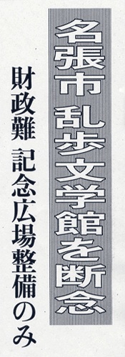 名張市の亀井利克市長は十三日、本町の旧桝田医院第二病棟跡地に地元出身の作家江戸川乱歩の生家を復元して「乱歩文学館(仮称)」を整備する計画を断念し、跡地は広場として記念碑を建立する程度にとどめる考えを示した。市議会一般質問で明らかにした。