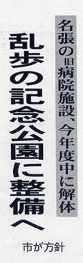 続いて、事業計画案の検討に入った。乱歩関連施設整備事業で、生誕地の「旧桝田医院第2病棟」(同市本町)の解体工事費などに計950万円が計上された計 画案に対し、出席者から「昨年度の計画案では乱歩文学館の整備が明記され、総会で承認もされた。変更に関し、なぜ何の情報もないのか」「市長が『乱歩』を どうしたいのかが見えてこない」などと不満の声が相次ぎ、承認が先送りされた。
