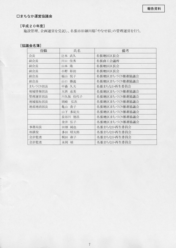 報告ったって、ただこれだけのものである。なにを報告しておるのかもようわからん。やなせ宿の運営を受託したのなら、どんだけの予算が転がりこんできたのか、その程度のことは報告したらんかとも思うのだが、それすらない。ちなみに、昨年6月から今年の3月までの委託費として、名張市から協議会に二百七十七万円が転がりこんだと聞き及ぶ。ただまあ、こうして報告資料をみてみると、会計監査のかたもいらっしゃることだから、年度末を迎えて、せめて監査報告くらいは公開されるのであろうな。