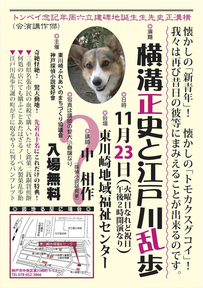 神戸市の東川崎地域福祉センターで、横溝正史生誕地碑建立六周年記念イベントの講演会が催された。